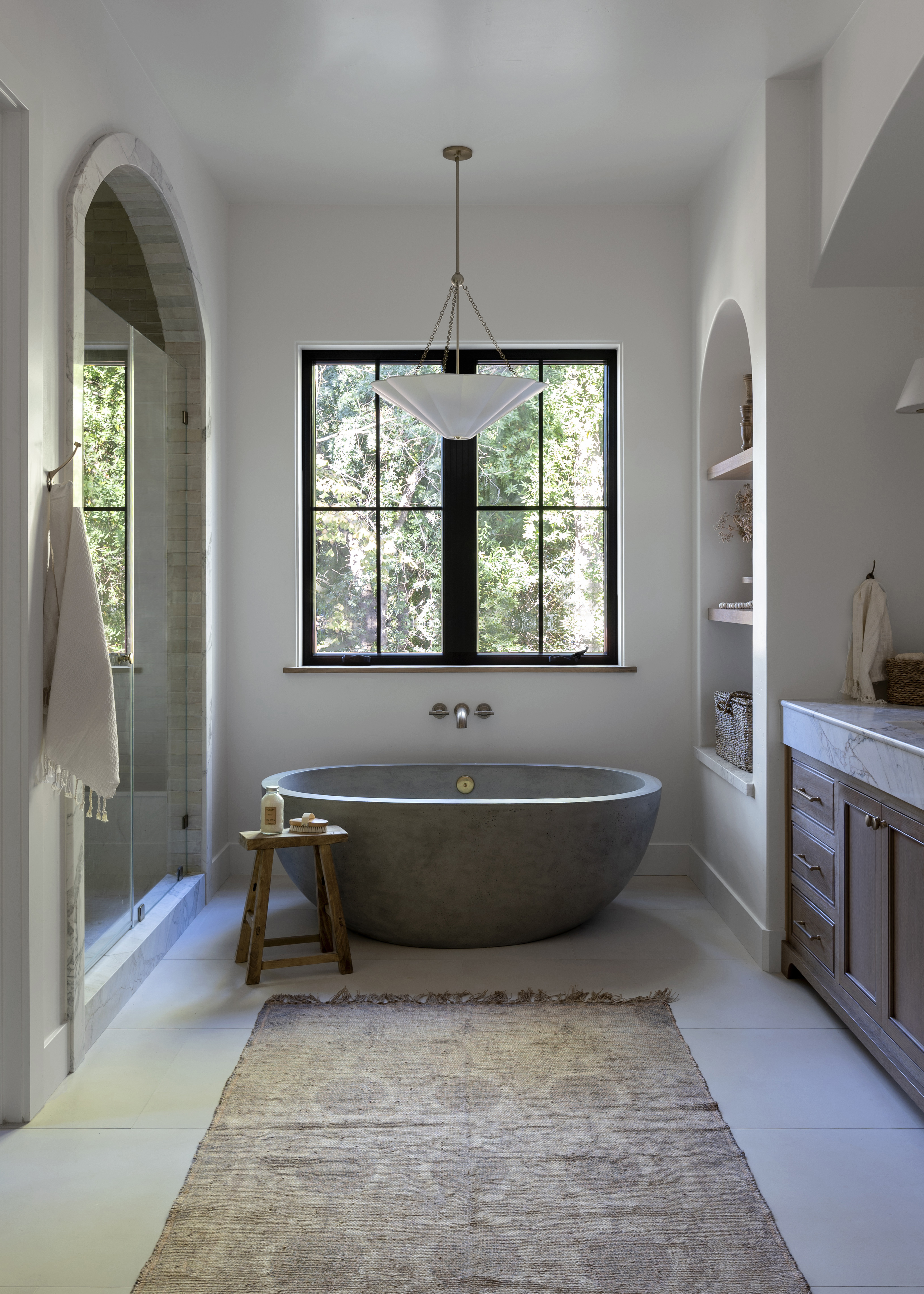 Minimalist in nature, Organic Modern spaces favor simple silhouettes, warmed up with organic materials and soft curves. A concrete soaking tub is the focal point in this dreamy retreat by Nicole Salceda. The neutral palette anchors the space, allowing natural accents like a wooden vanity cabinet and woven heirloom rug to shine. Hanging delicately over the tub is a scalloped, linen pendant. Aged brass accents along with the crisp white shade balance out the warmer tones in the bathroom.