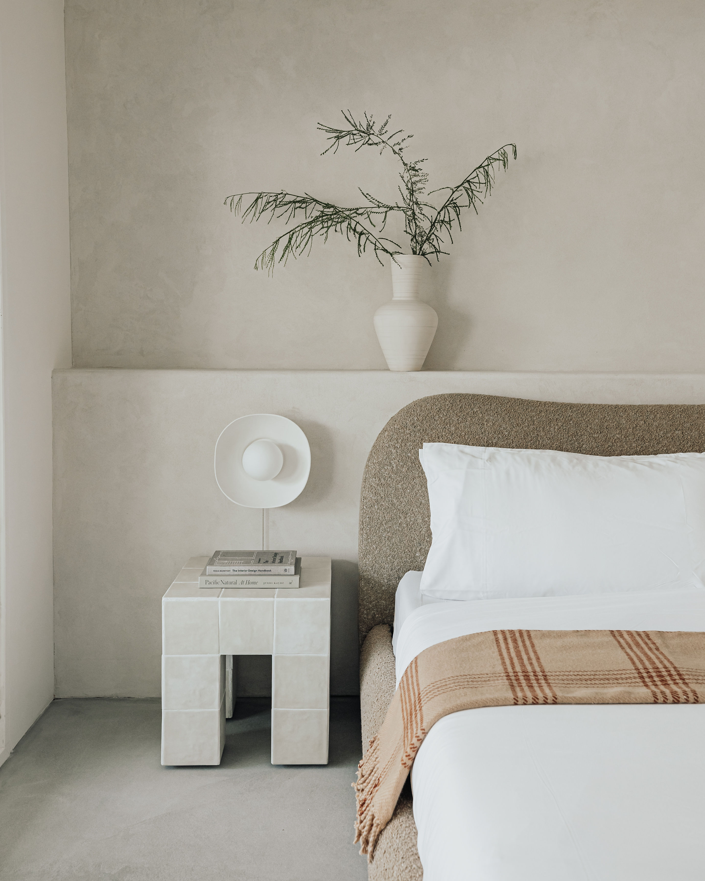 Earthy homes offer a retreat to the modern world, lending a muted color palette to soften the senses. Organic modern colors include white, cream or nude with cool tones like blue and gray mixed in for contrast. Brighter earth tones like green and terracotta can be added to liven things up. In this Palm Springs primary by Desert Minimalism, a limestone wall feature is the perfect backdrop for varying textiles and soft modern lighting.