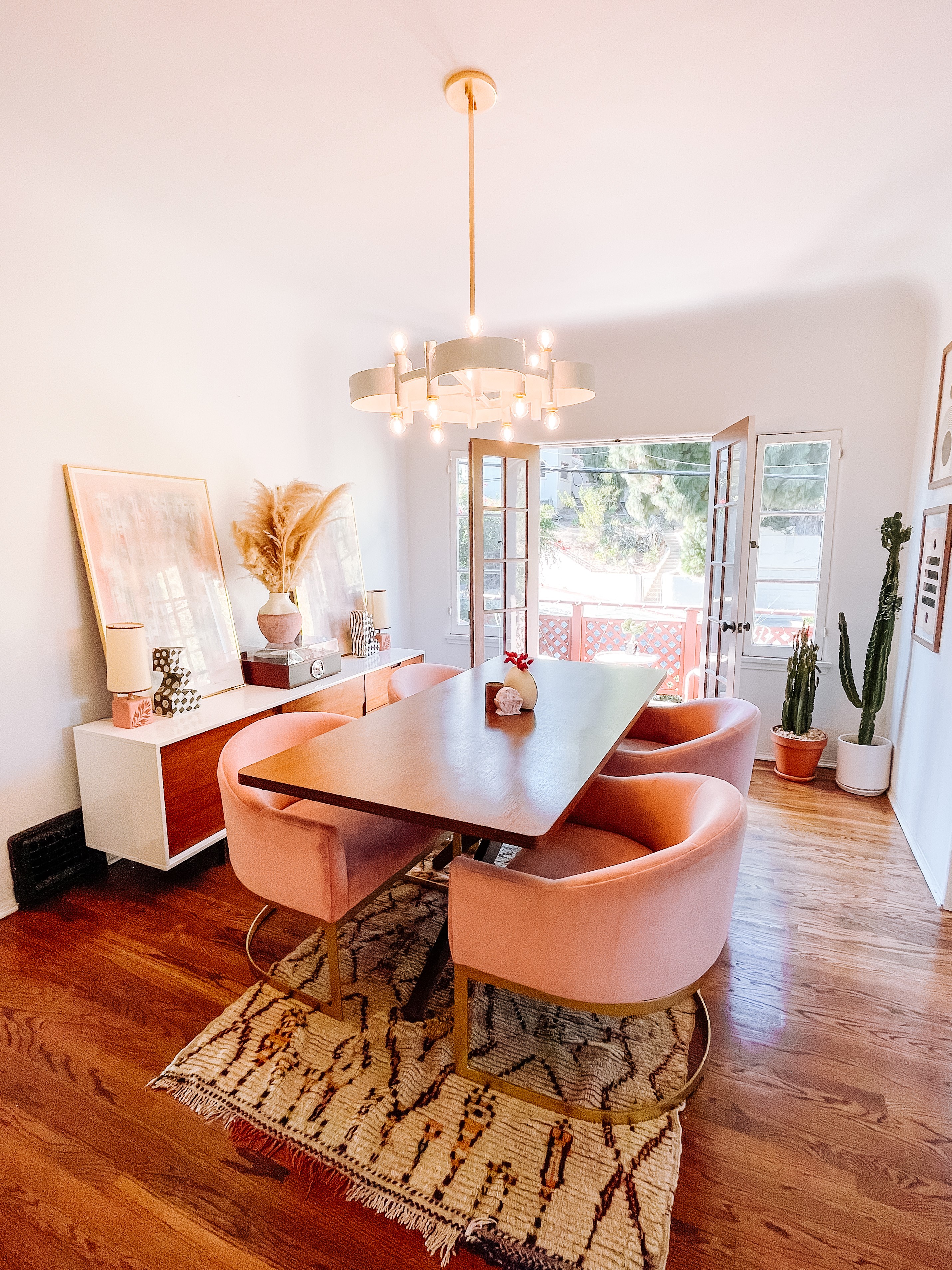 I like to consider these three things. Era/style: Lighting looks change drastically by era and style. If you are going for a specific theme in a room or space, I would get lighting that matches that vibe. Our penthouse is super art deco, so there’s funky brass and heavy glass pieces. Metallics: I generally try to keep metals within the same family when possible. If I do have to mix metals due to something I can’t change, I try and equally incorporate both so it feels intentional. In our desert house, I can’t swap out the silver handles of our original vintage oven, but I really wanted to add a new brass faucet and handles. I decided on a multi-metal lighting fixture that unified both silver and brass! Light output/tone: Of course the decorative aspect of lighting is important, but at the end of the day they have a very functional job to do. I try to pay attention to the wattage and amount of light a fixture will put out and how that will fit into a space. Some places you may want a moody vibe, like a dining room, and some places you may need it bright, like a kitchen or art studio.