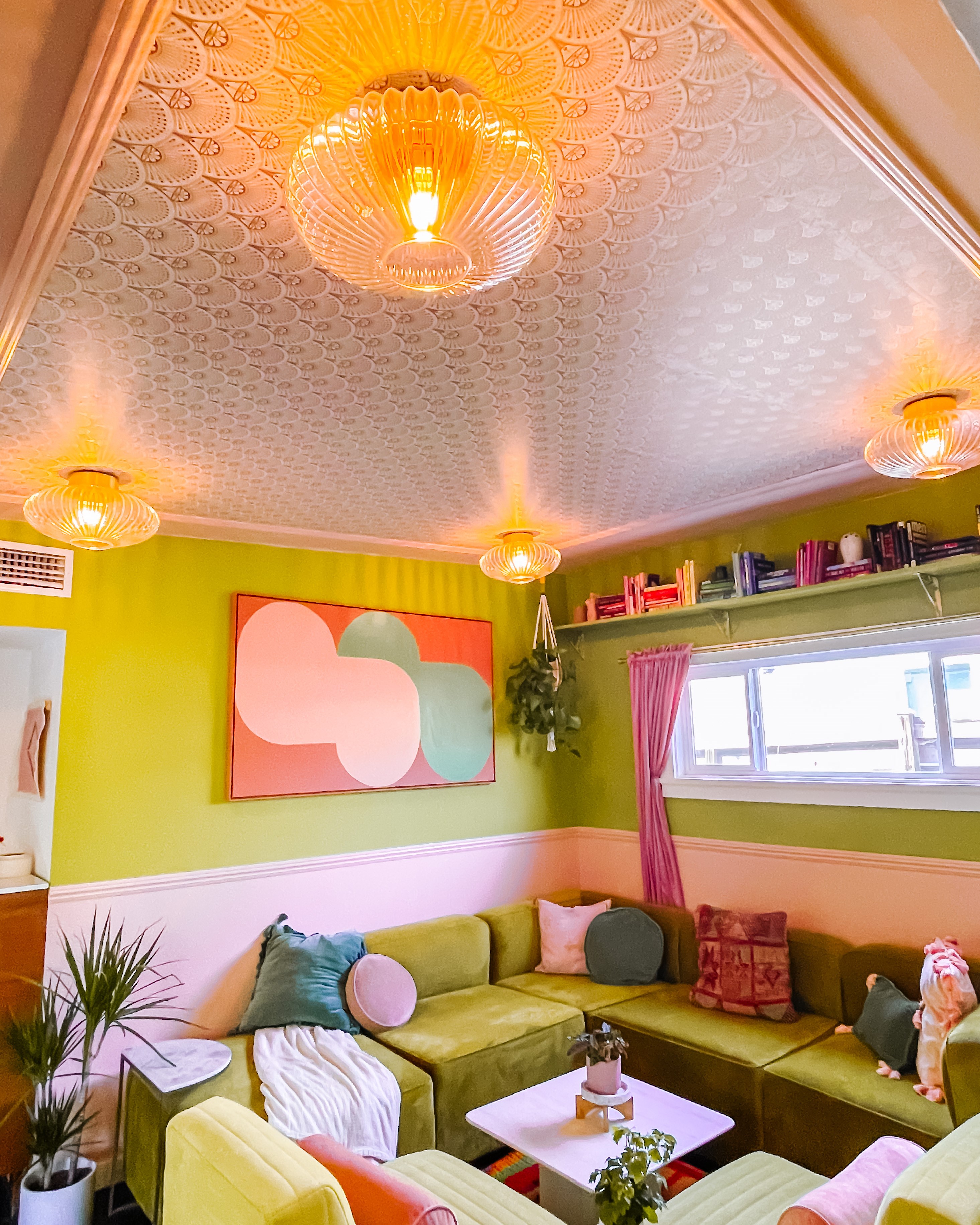 Dani Nagel @dazeyden went all out in the den of her Los Angeles home. “We wanted to create a cozy conversation pit. We switched out our canned lighting for these Mitzi beauties and built a framed wallpaper moment on the ceiling with this deco martini print from Divine Savages.”