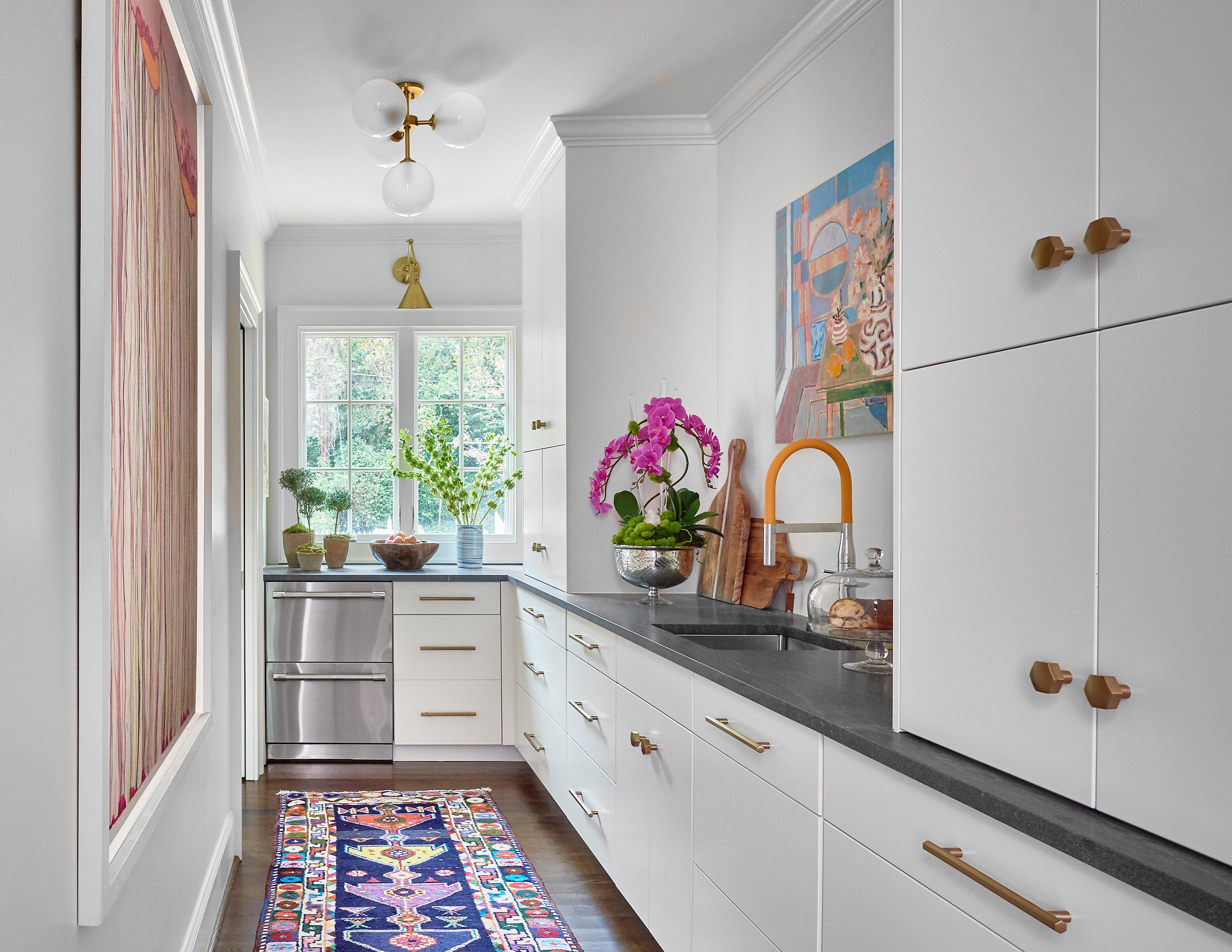 Track or can lights in the ceiling used to be the go-to for ambient or overhead lighting in the kitchen. Now, we have more choices than ever to infuse style and personality into our homes. A chandelier in the kitchen makes a statement and adds beauty from above. A well-placed pair of matchy semi-flush mounts or even some bright pendants can have the same effect.