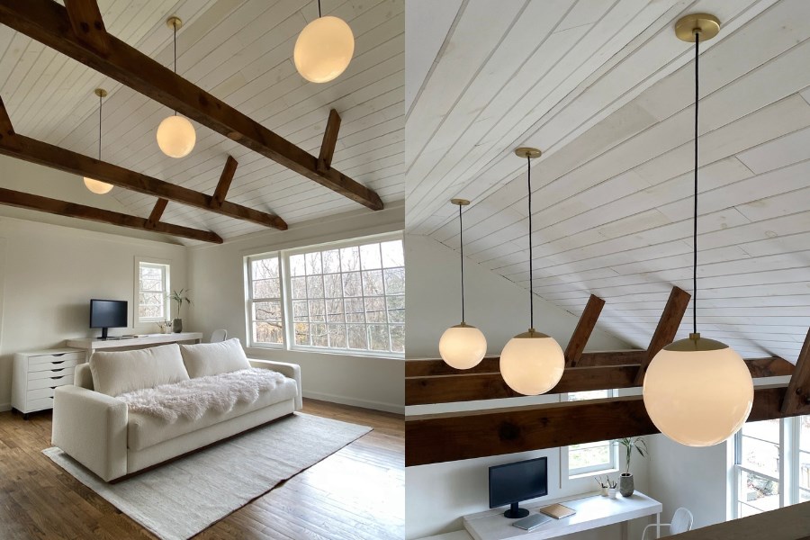 My favorite space is our newly renovated cottage building (typically used as a home office), where we just hosted Thanksgiving with our family and friends and plan to spend lots of time throughout the rest of the holiday season. The space is equipped with a pellet stove, sleeper sofa, as well as three Stella Pendants, which totally fill the space with light.Â