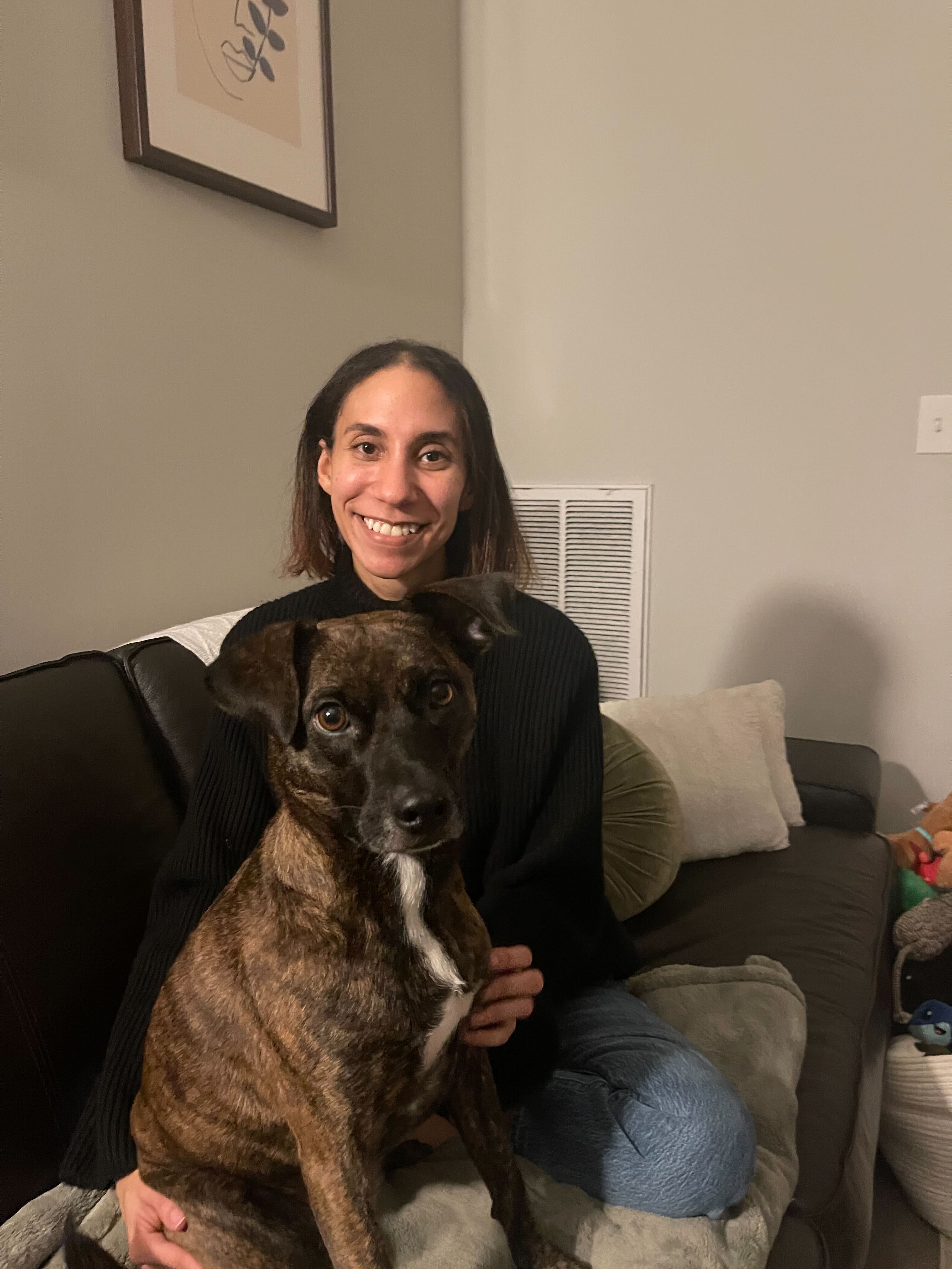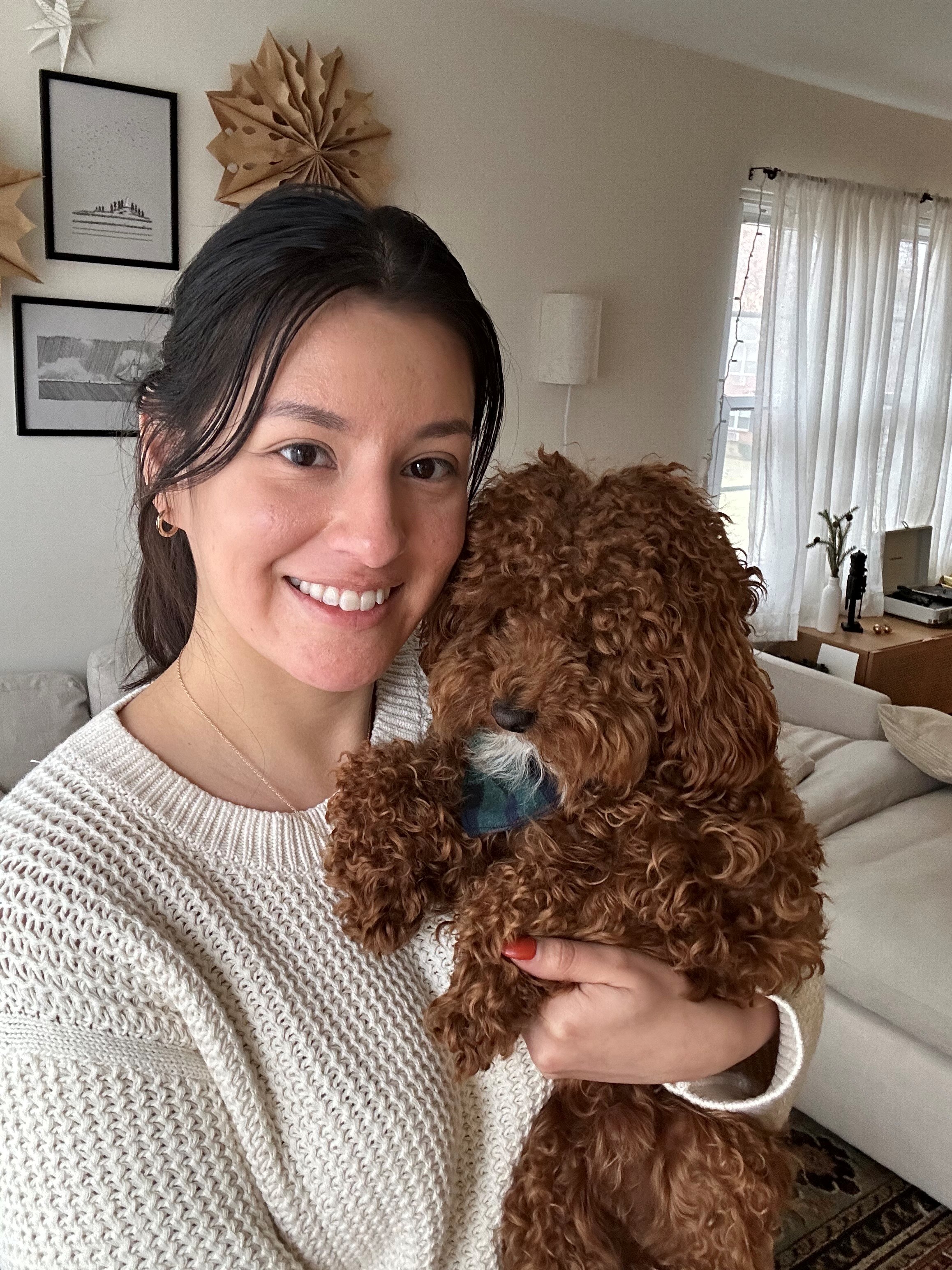 I like to set the mood with small tweaks like holiday-scented candles, cozy blankets, and decor like stockings and minimalistic garlands. I love a mini-tree situation since I have a smaller space and always use ornaments that have been in my family for decades. You can also find my dog Olive in a holiday sweater 90% of the time 🙂Â