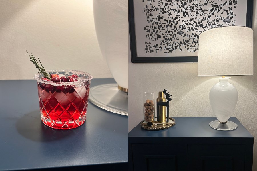 I like to go for a subtle but cozy feel. My go-to for achieving this is using Frasier fir candles and oils around the apartment. It's my favorite holiday scent that feels fresh and warm. I add touches of winter greenery around for a simple holiday look. Lastly, I turn off the big lights and only use accent lighting like table lamps and plug-in wall sconces. Lighting is key for setting the right mood during this time of year! My favorite piece is the Laney Table Lamp, which sits on my bar cabinet. It has such a beautiful glossy base and soft glow!Â