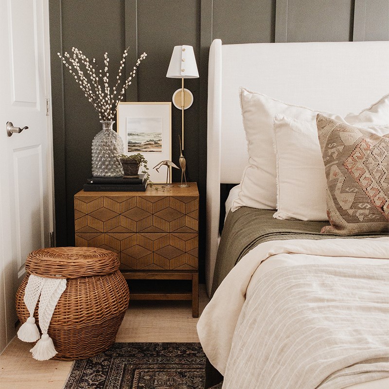 Think outside the box when it comes to placement. This bohemian retreat features two plug-in sconces installed over a bed frame, taking task lighting to the next level. Ideal for reading, meditating or let’s be honest—scrolling—overhead sconces provide the perfect spotlight and free up space for bedside styling.