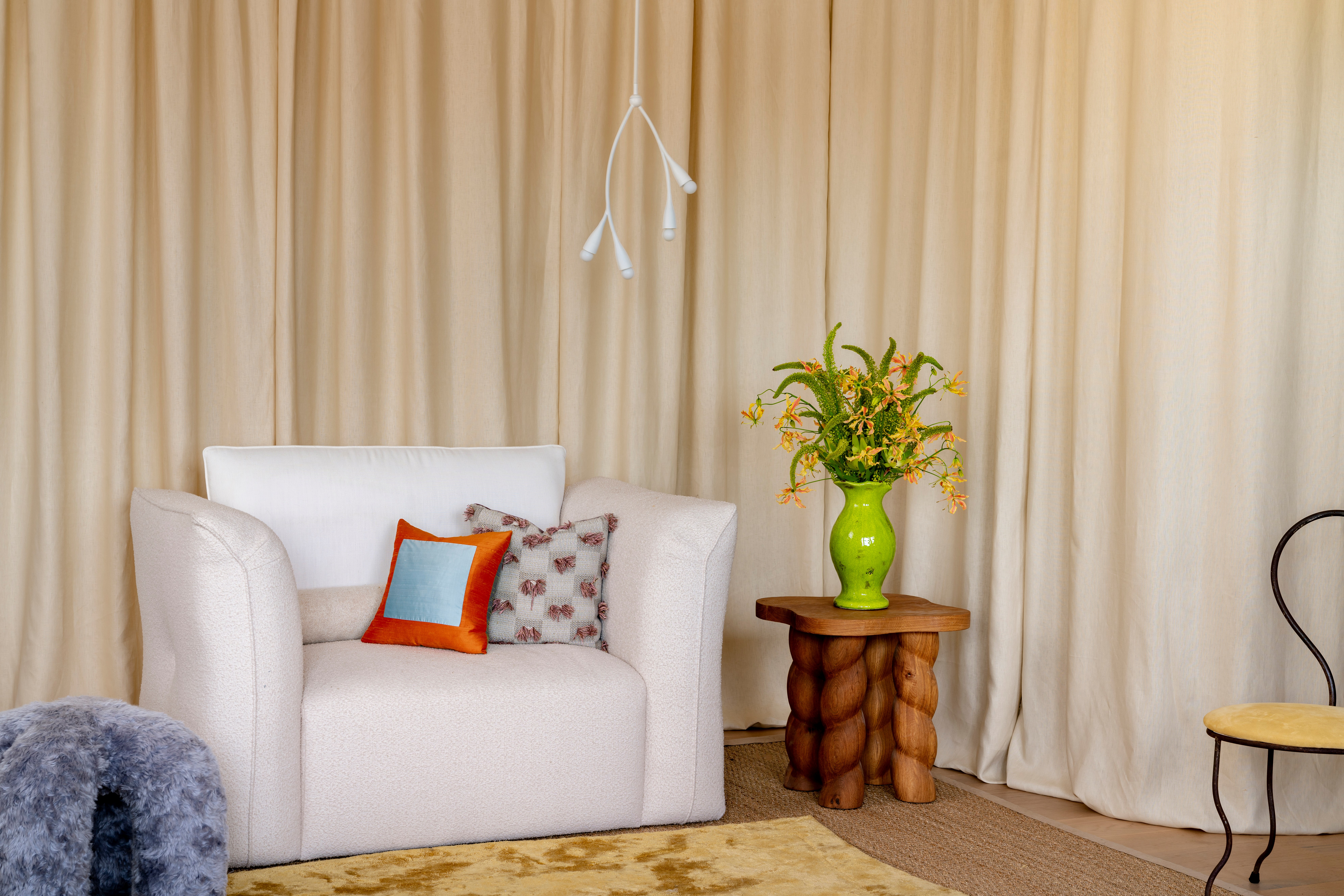 Bring your space to life by introducing natural materials and organic shapes. For example, the single cherry blossom-inspired Elsa pendant hanging over a cozy upholstered chair and sculptural end table gives this reading nook a Zen vibe.