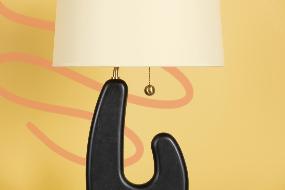 Regina is fun, funky, and flexible with her mix of textures, sculptural nature and has versatility for a variety of looks. This piece was inspired by a wooden Danish sculpture floor lamp I have been obsessing over. And I really wanted to experiment with a lamp base that was asymmetrical in design but also grounded in a darker finish.