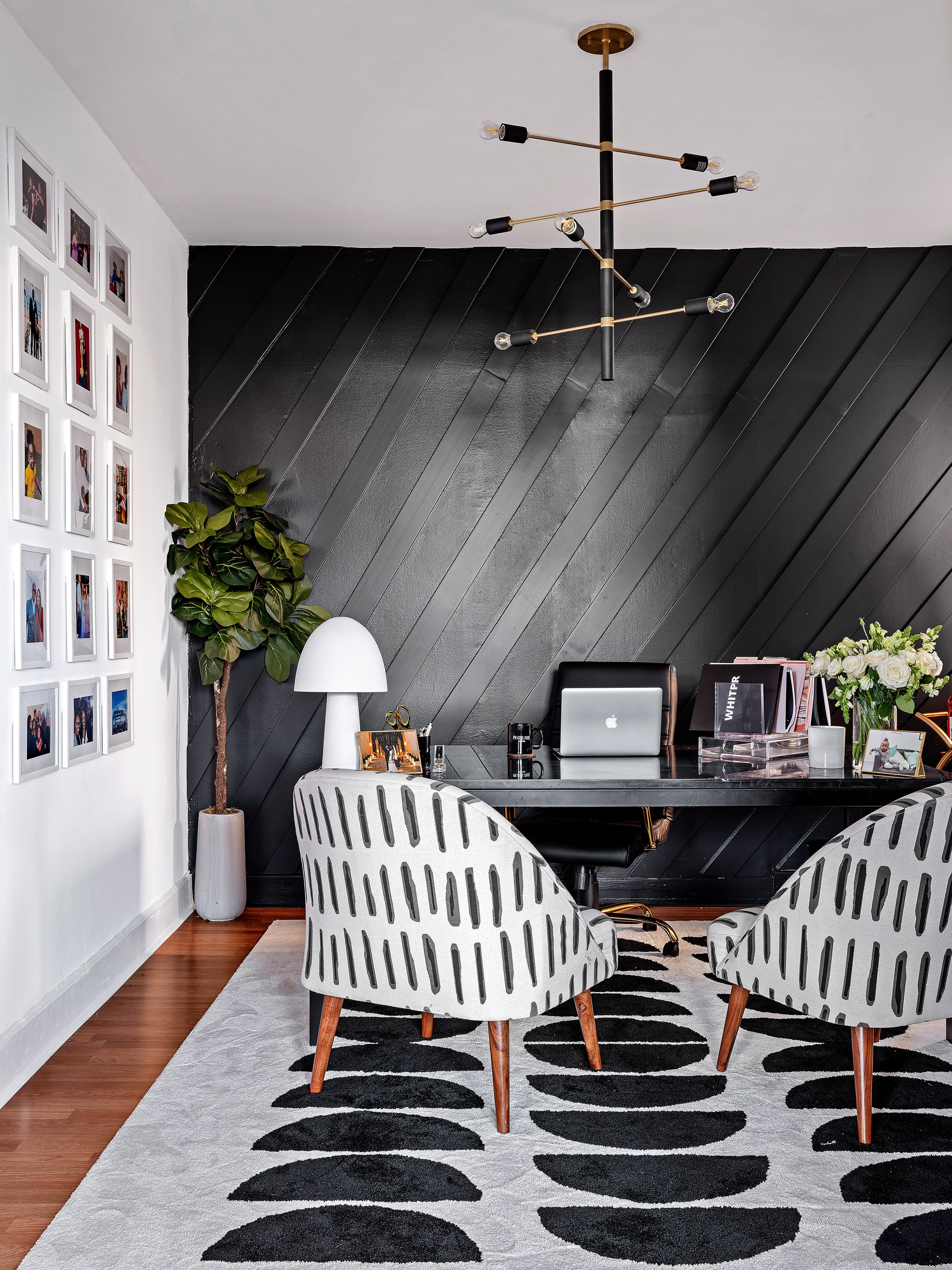 We chose the Vicky Table Lamp for my office—obsessed. I have a black desk and black accent wall and the white looks amazing against that dark, moody backdrop. We also went for the Astrid 8 Light Chandelier for a simple statement above my desk.