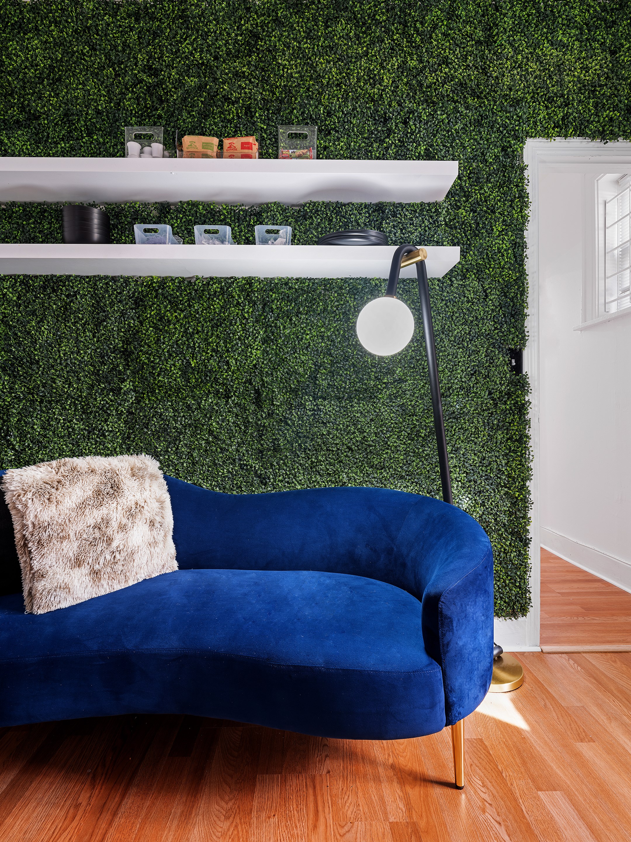 I try to think of things that would make me excited if I were coming into a new workspace. We created this cool mini-conference space in our open floor plan. When you step into the space you feel an air of creativity. The backdrop features a brick wall with a sign that says “pitch, please” since we’re in the pitching business. We have wisteria falling from the ceiling... I also worked with our contractor to build a door for privacy but it has glass panels so that the space feels open. Because we work in such a service-based industry with demanding clients, I want you to be in a space that will combat some of the stress. I want folks to come in and feel like it’s a breath of fresh air.
