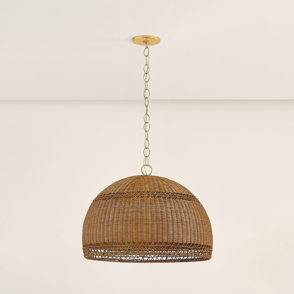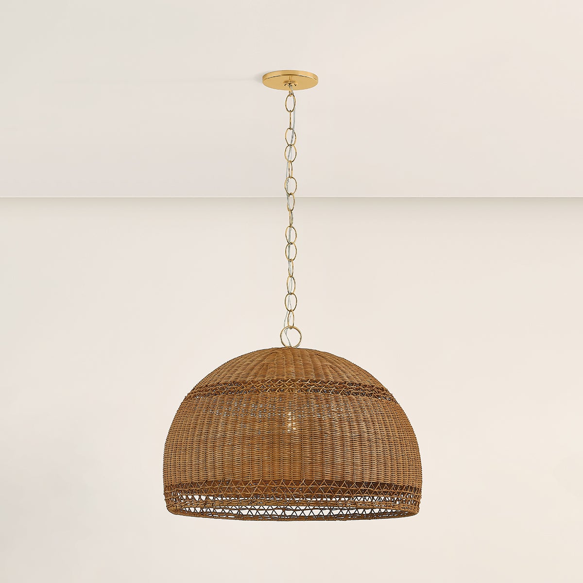 Leaning into vintage basketry techniques, the large wicker shade of the April pendant is unique, yet relatable. The shade is broken up into sections by two horizontal areas of open weave, allowing light to spill out. A classic chain suspends the fixture, adding a note of refinement to the woven naturals.
