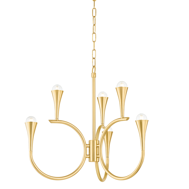 A modern interpretation of an Art Deco chandelier, Aviana makes a dramatic statement. Trumpeting metal shades rise from a swooping frame, filling both vertical and horizontal space with light. The airy, graceful arms feel almost musical, lending this chandelier a dynamic and joyful quality.