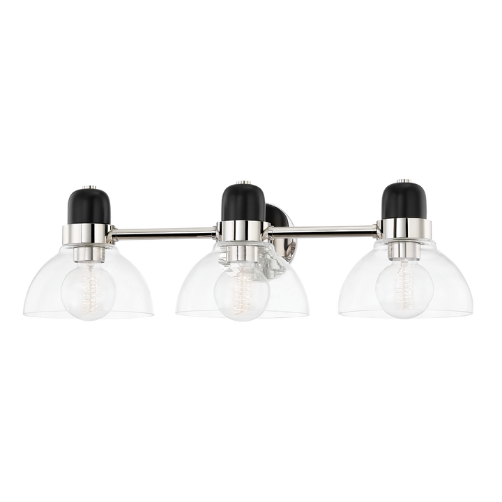 A modern industrial muse, Camile draws inspiration from the classic bistro light. Contemporary accents like the open, exaggerated shade allow light to flow freely, giving the piece a natural mystique. A soft black finish is accompanied by aged brass or polished nickel, providing a two-tone effect that is offset by hand-blown glass.
