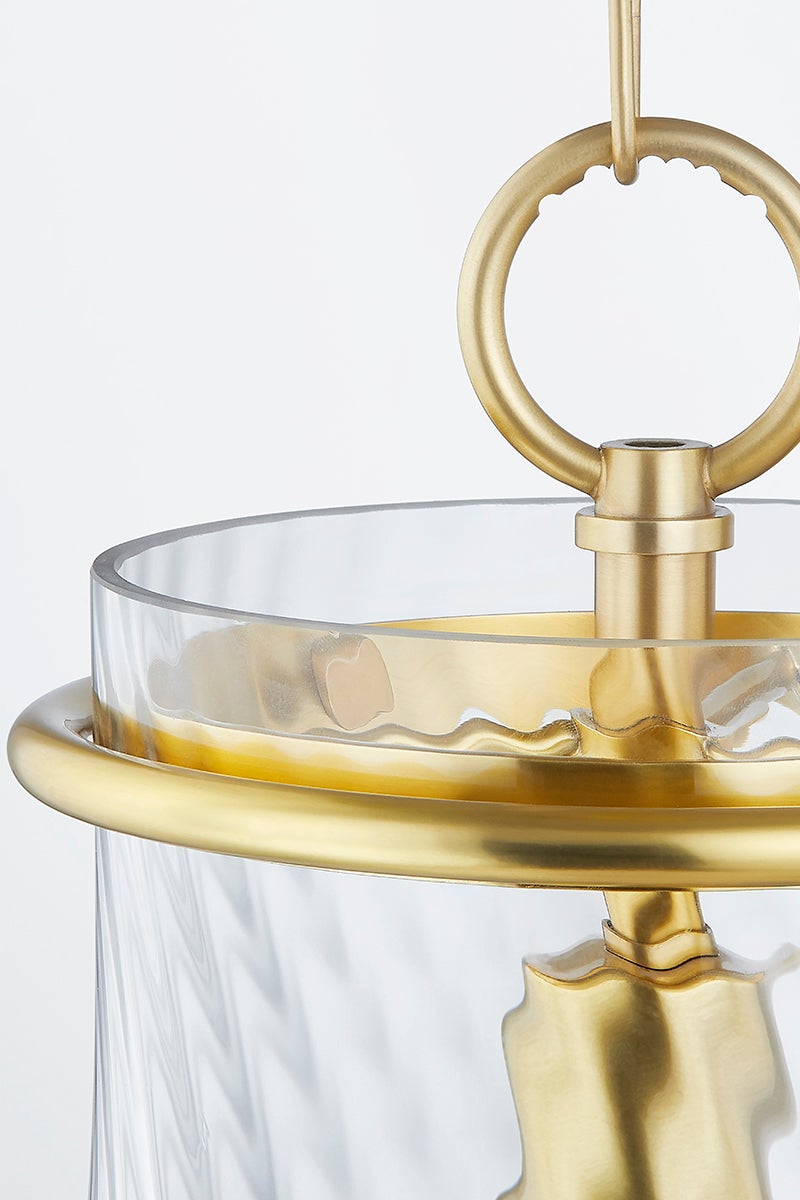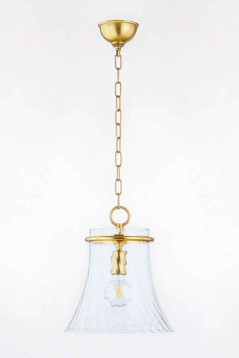 Cantana features a recognizable pendant silhouette in clear optic glass with a swirl pattern. The subtle lines in the swirled glass refract light and cast a soft glow when lit. A metal ring at the top in Aged Brass or Old Bronze draws the eye and adds a little shimmer. With both traditional and modern elements, this pendant is perfect in new traditional interiors.