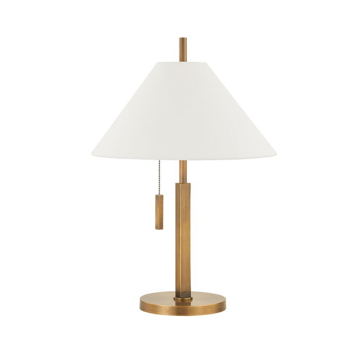 Clic is classic and tailored. An extruded square body set atop a circular base extends into a slim pole that pierces through a tapered, off-white linen shade to create a layering of simple geometry. The pull chain adds a stylish and functional detail, while the all-over Patina Brass finish contributes to the sophistication of this collection. Clic is available as a floor and table lamp.