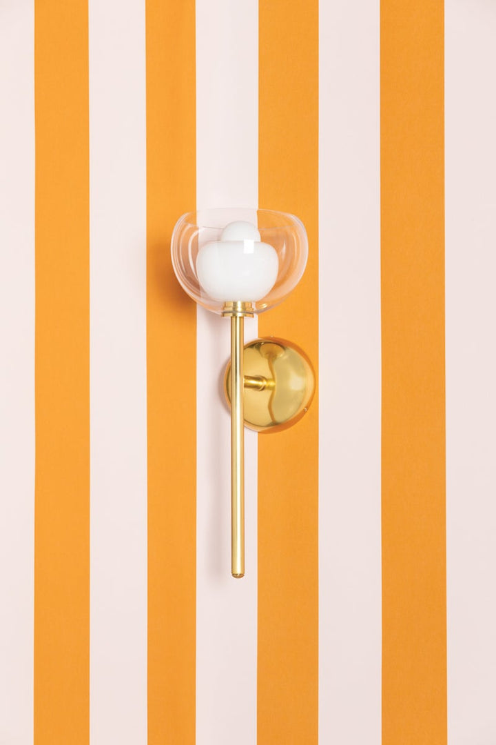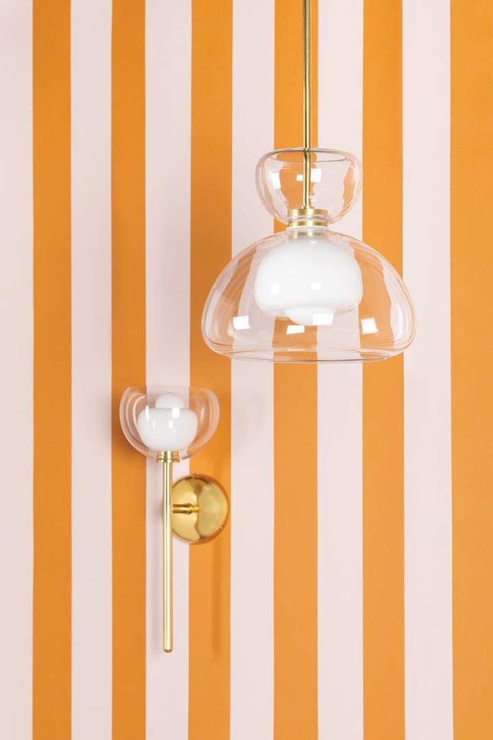 Cortney is a gorgeous combination of mixed glass with Aged Brass. An opal glossy glass shade is captured within a clear glass shade for a look that is both trendy and useable. Light flows through the open shades and reflects inside them. The opal glass table lamp, with its visible Aged Brass pull chain, adds a stylish pop and polish to any space. Also available as a wall sconce, semi-flush, and pendant. Part of our Home Ec. x Mitzi Tastemakers collection.
