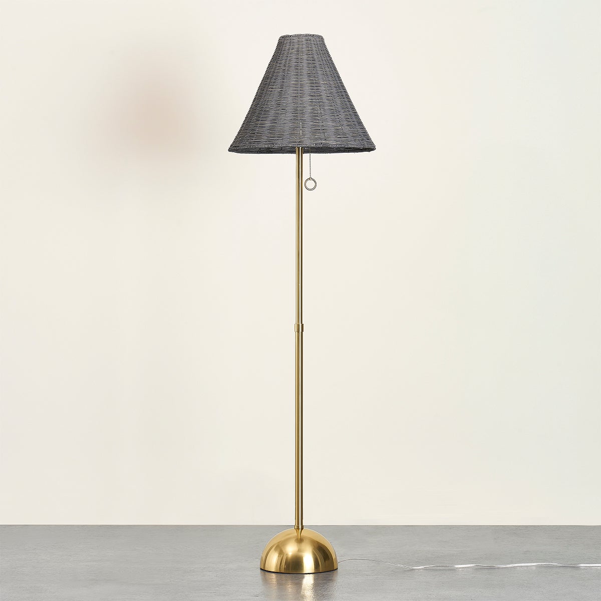 Combining the beauty of natural wicker and polished Aged Brass, this coastal-inspired fixture exudes understated elegance. When illuminated, the golden-hued brass gleams through the gray wicker, creating a warm and earthy glow. Available as a sconce, pendant, or floor lamp. Part of THELIFESTYLEDCO® collection.