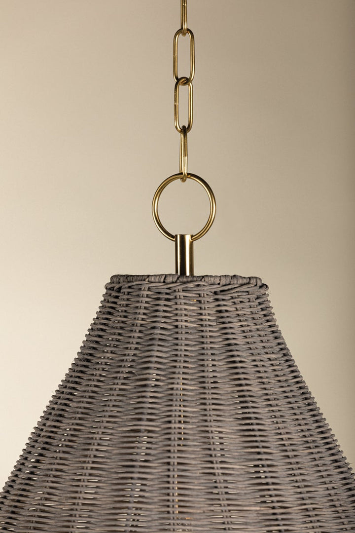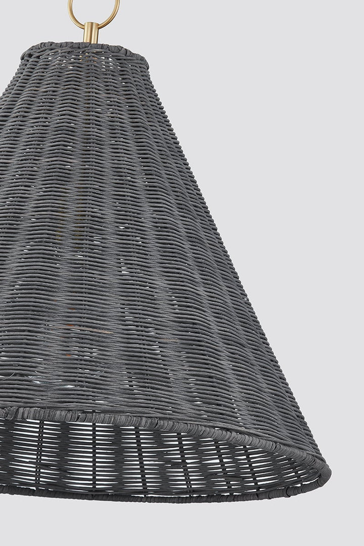 Combining the beauty of natural wicker and polished Aged Brass, this coastal-inspired fixture exudes understated elegance. When illuminated, the golden-hued brass gleams through the gray wicker, creating a warm and earthy glow. Available as a sconce, pendant, or floor lamp. Part of THELIFESTYLEDCO® collection.