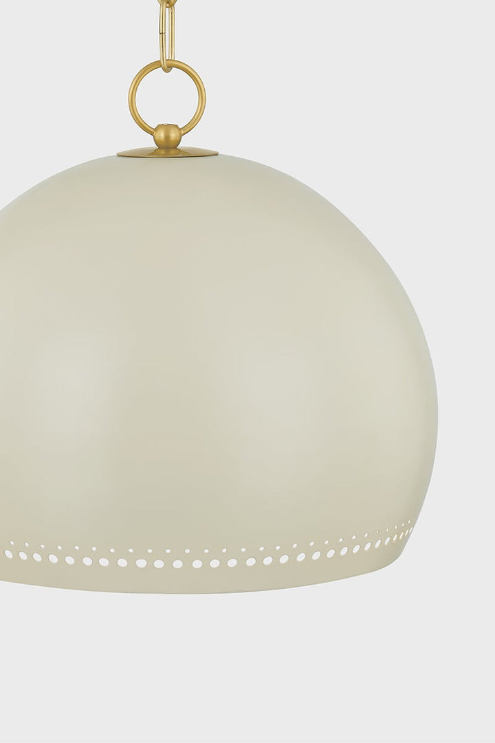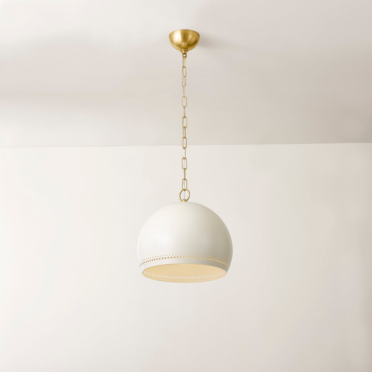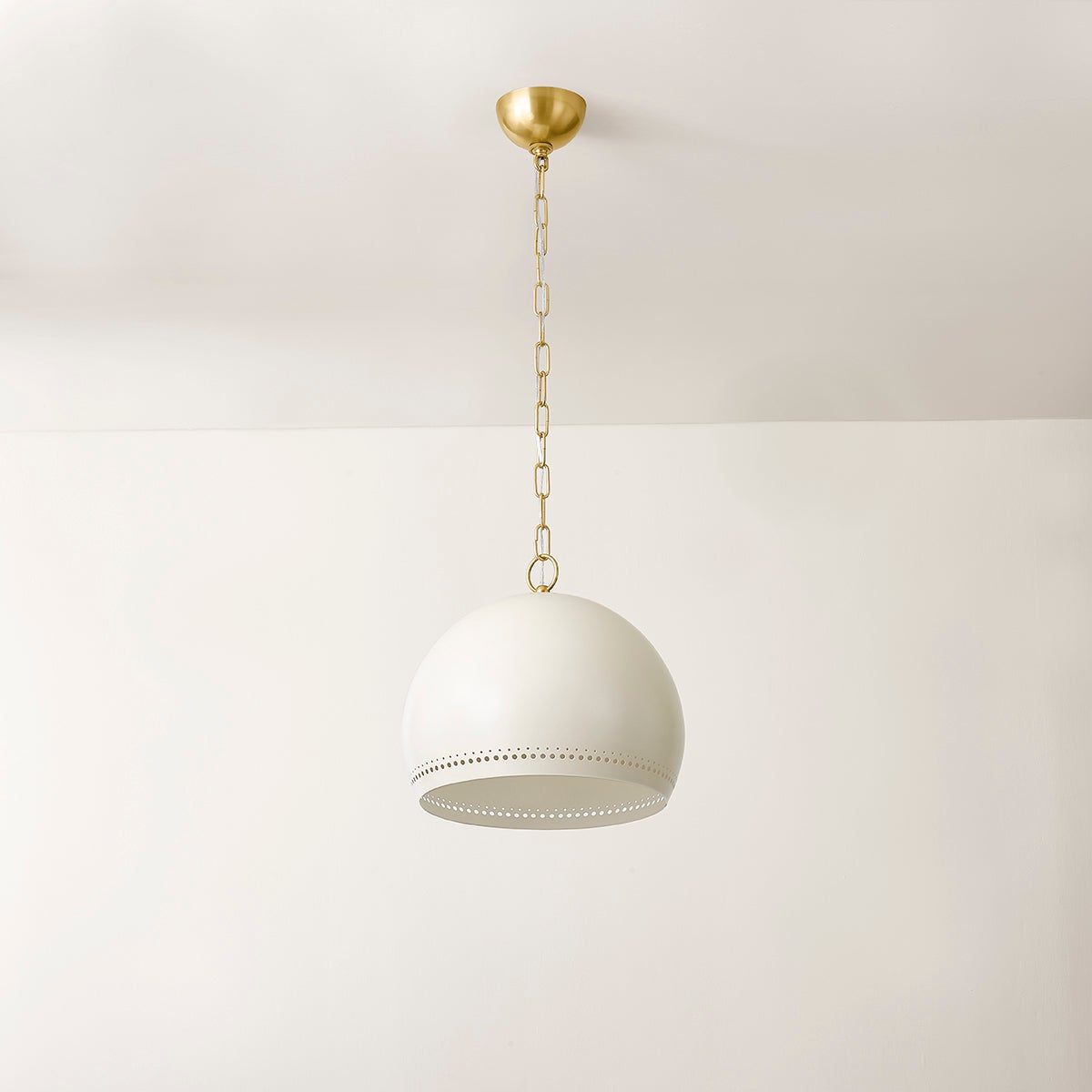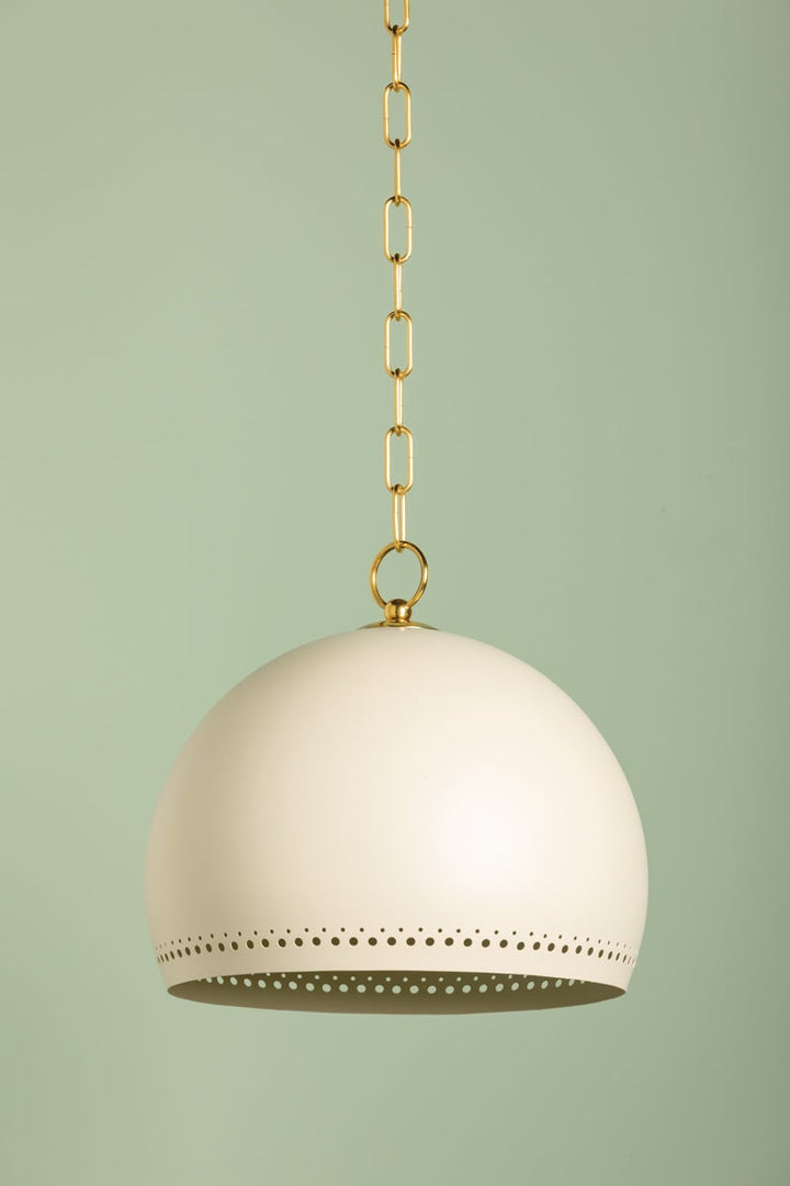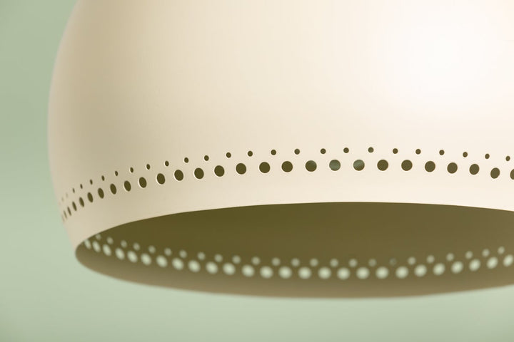 The simple silhouette of Etna is punctuated by design details that create an elevated, chic lighting experience. A glossy Soft Cream hue is painted on the shade and emanates a warm glow from within. Delicate circular perforations allow light to filter through, casting unique shadows that play across the walls of the room. Available in two sizes, Etna will light up a kitchen, breakfast nook, or other desired area.