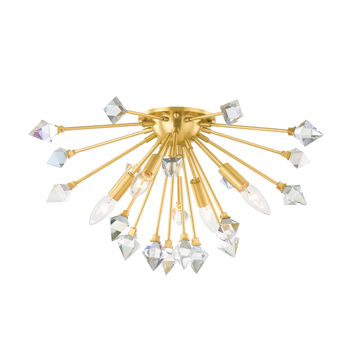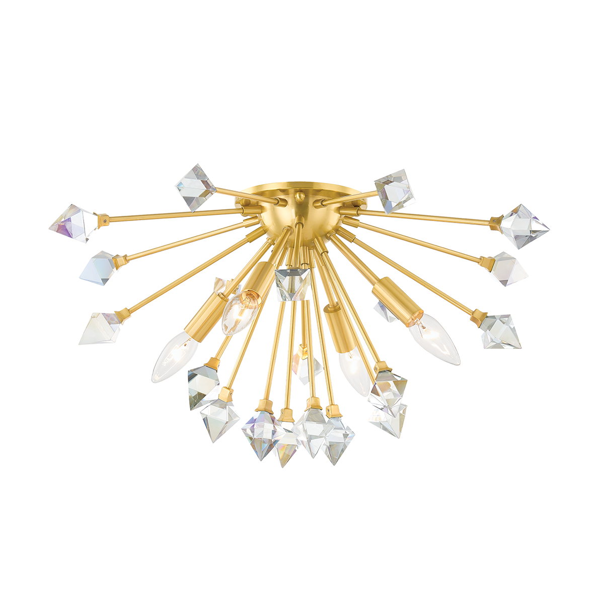 A Mid-century marvel, the sputnik style has captivated design fiends for decades. Genesis reimagines this icon, bringing celestial glamour in starburst form. Dancing between each light source are iridescent crystals, creating prisms of light throughout the room. Finished in aged brass, the Genesis Wall Sconce, Flush Mount, and Chandelier is the statement-making piece you need.