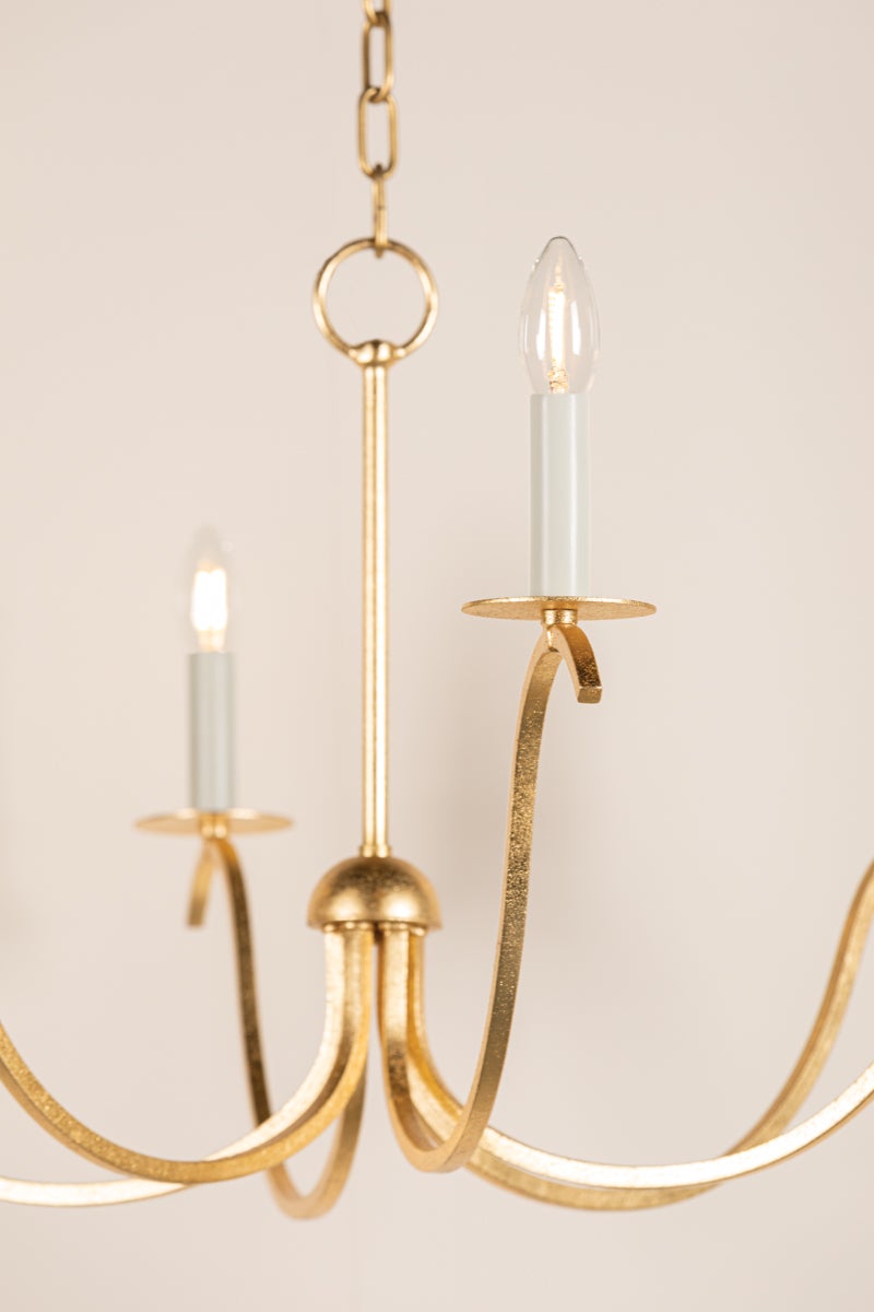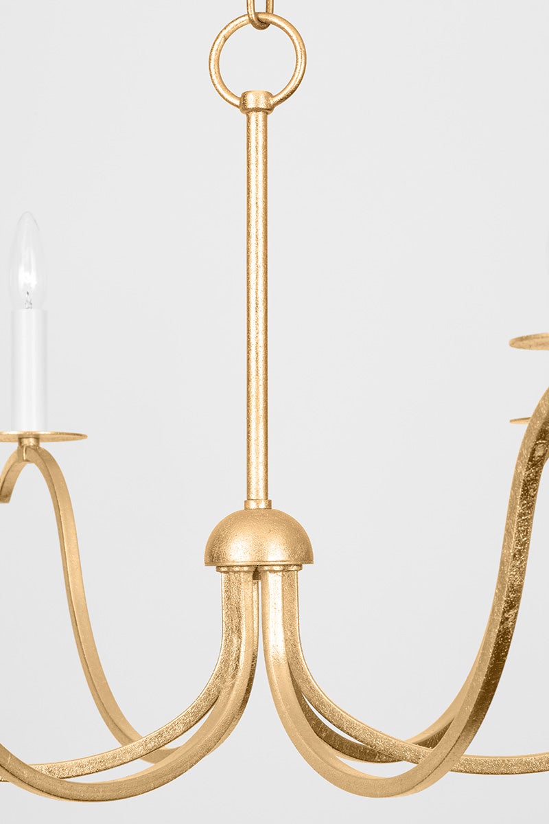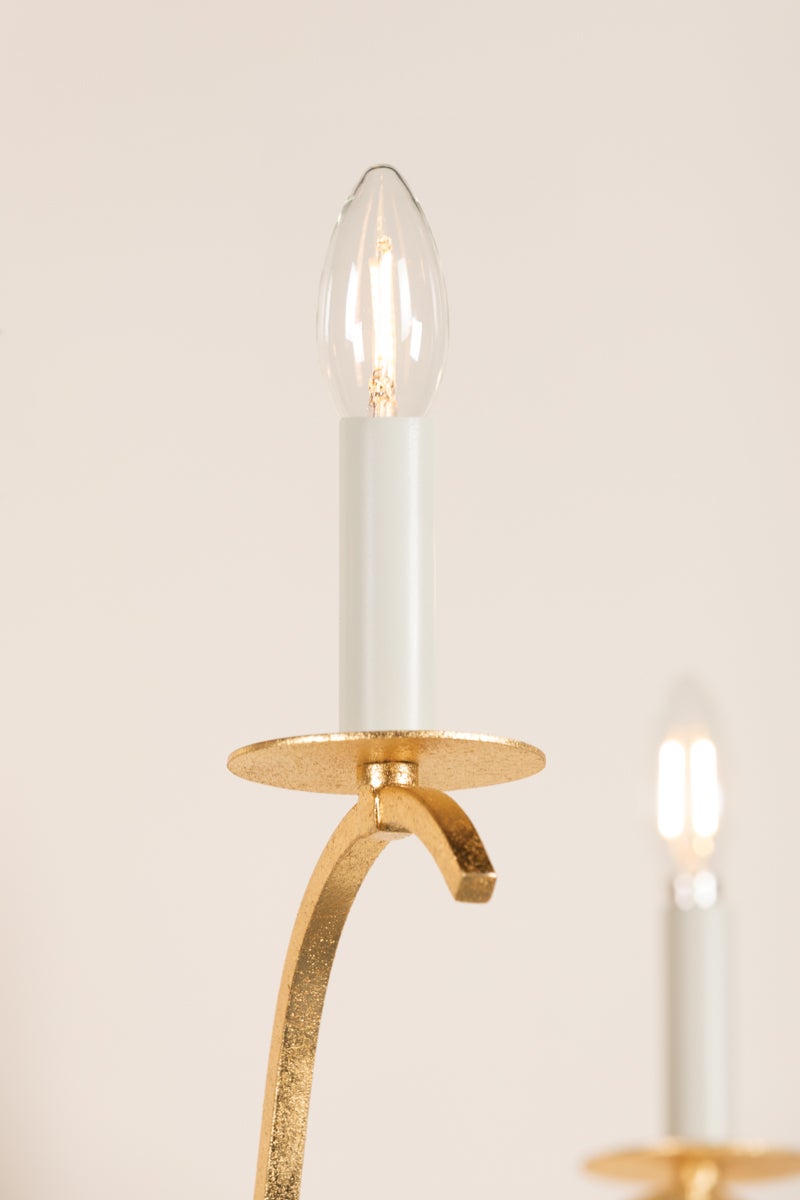 Slender, sweeping arms hold classic candlesticks for a simple, yet dramatic silhouette. The elegant Gold Leaf finish and chain detailing elevate the look. Jaclin's transitional design makes it perfect statement lighting in both traditional and modern interiors.