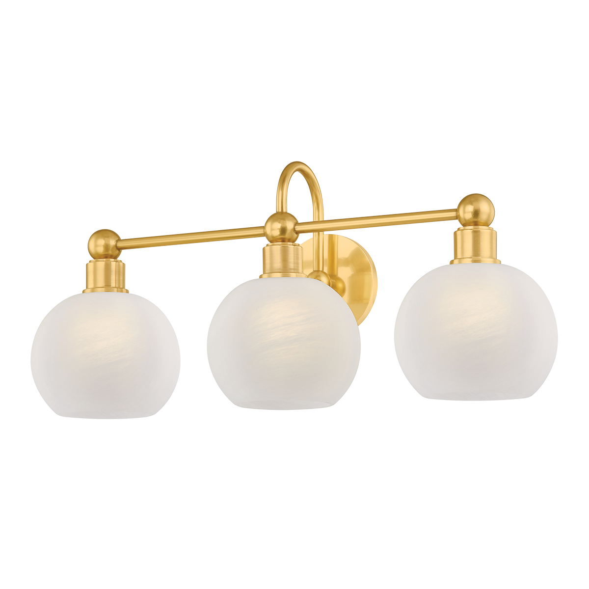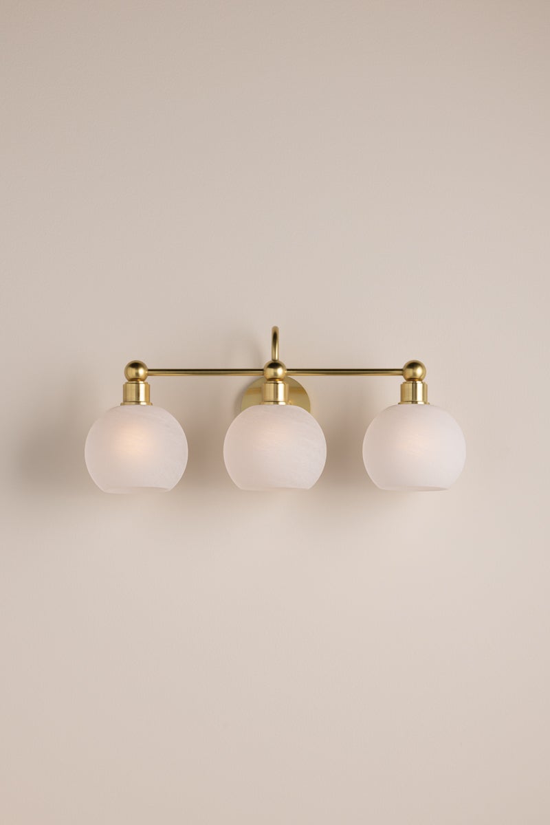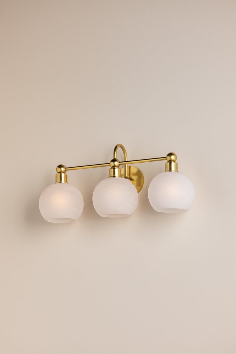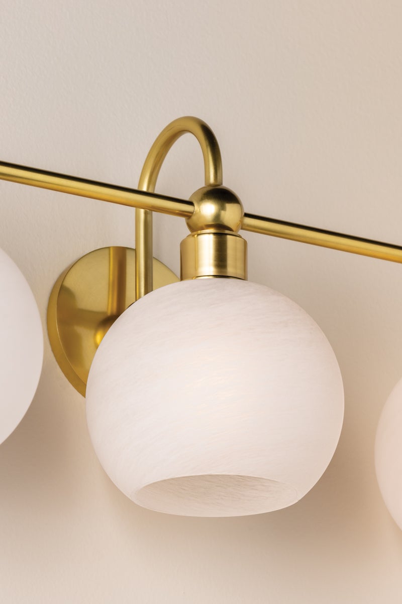 There’s a sense of visual ease in the continuity of circular forms in the Jerica bath light. The silhouette is understandable and usable, yet elevated by decorative sphere details, curved lines, and matte cloud glass globes. Choose from a gleaming Aged Brass finish, or opt for Old Bronze for a more modern take. Whether as a sconce or bath bar, Jerica illuminates your daily routines with serene style.