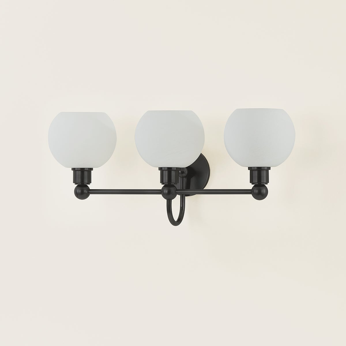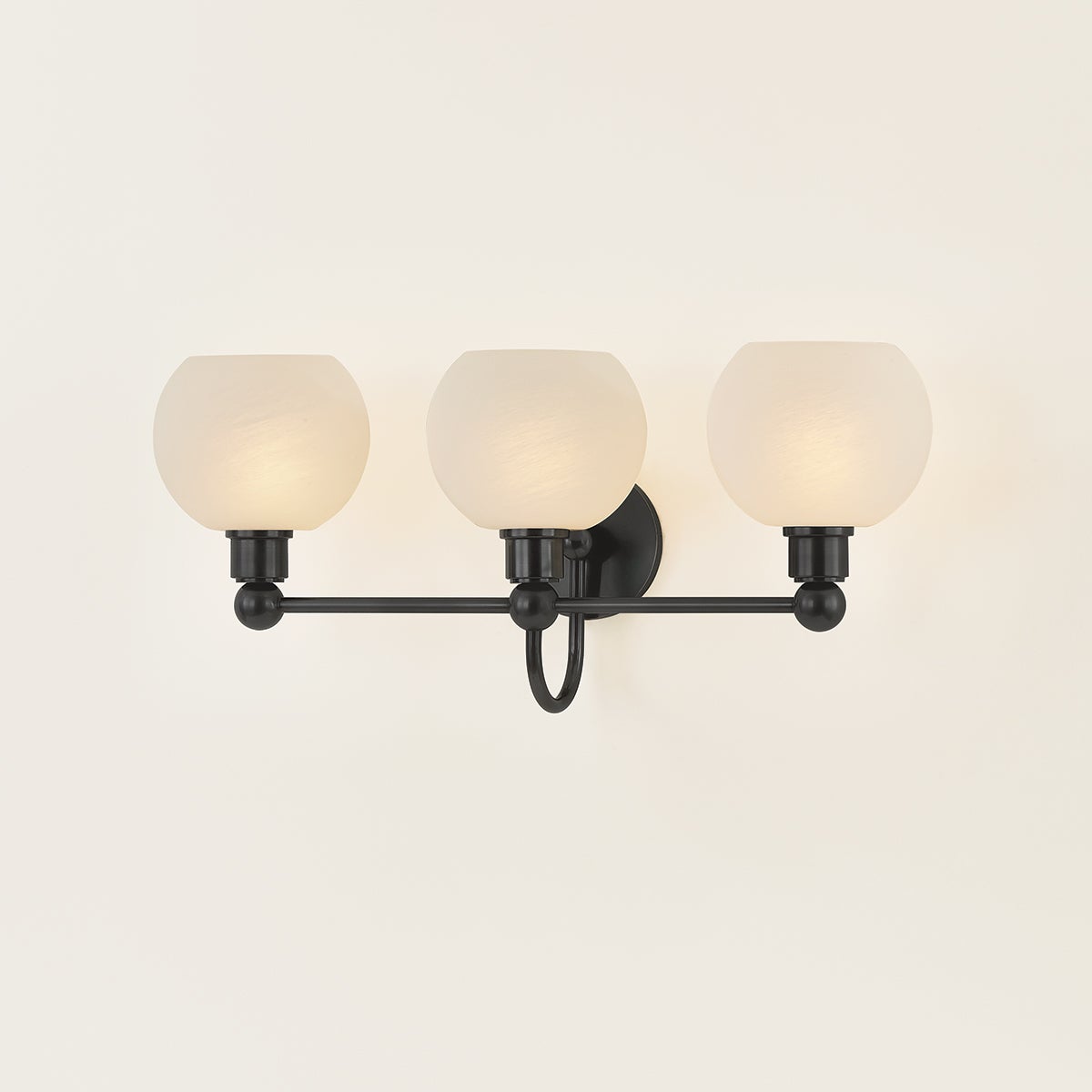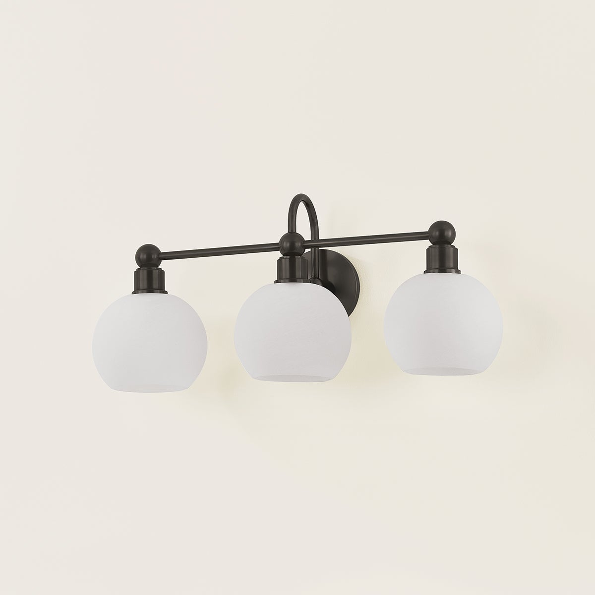There’s a sense of visual ease in the continuity of circular forms in the Jerica bath light. The silhouette is understandable and usable, yet elevated by decorative sphere details, curved lines, and matte cloud glass globes. Choose from a gleaming Aged Brass finish, or opt for Old Bronze for a more modern take. Whether as a sconce or bath bar, Jerica illuminates your daily routines with serene style.