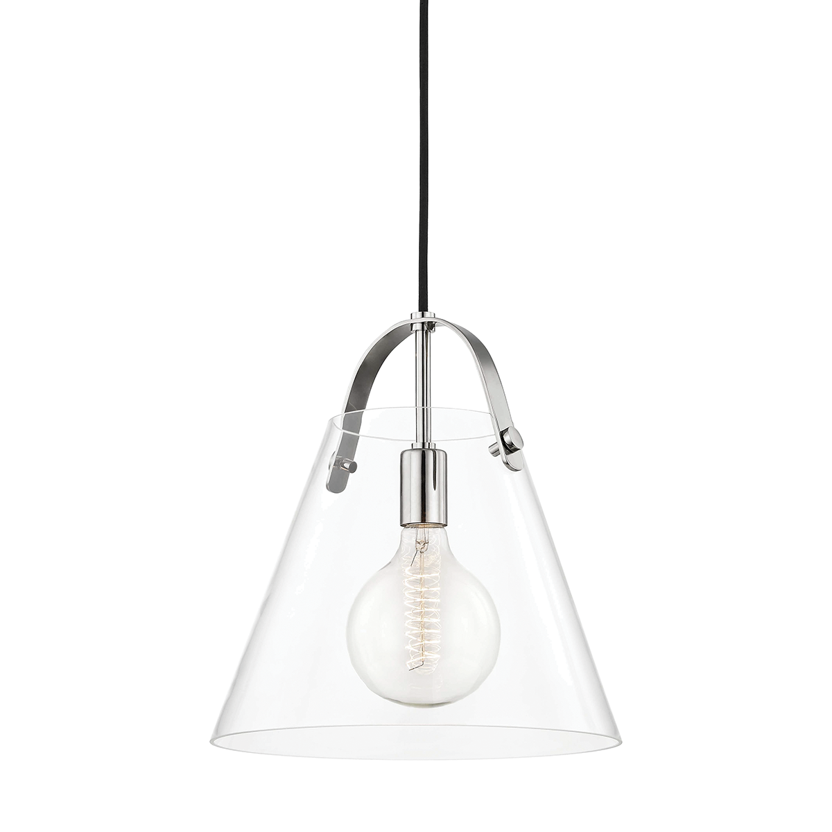 A metal strap arches over the open-top shade of this bell-shaped fixture that rings with style. An incandescent bulb shines through the clear glass shade—adding lots of light anywhere the linear, sconce or pendant is placed.