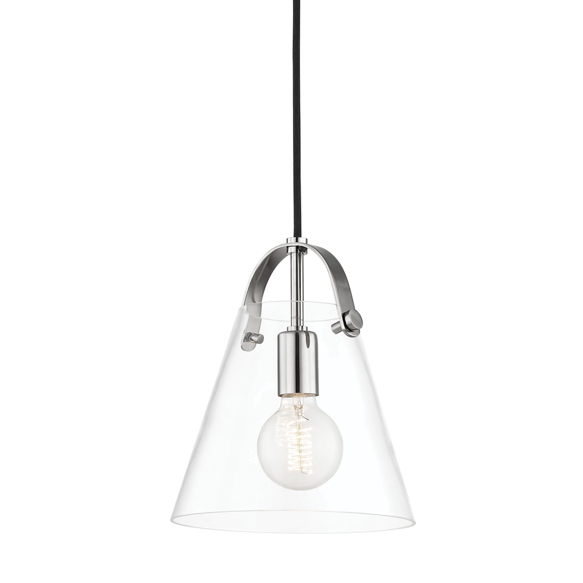 A metal strap arches over the open-top shade of this bell-shaped fixture that rings with style. An incandescent bulb shines through the clear glass shade—adding lots of light anywhere the linear, sconce or pendant is placed.