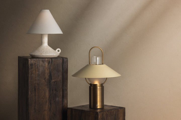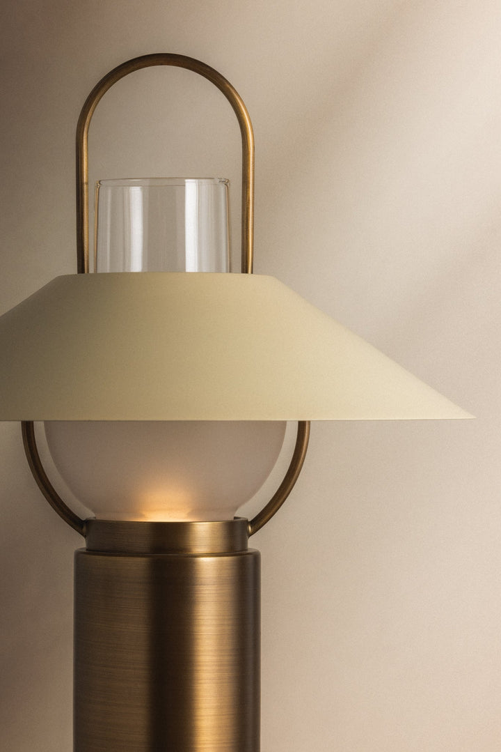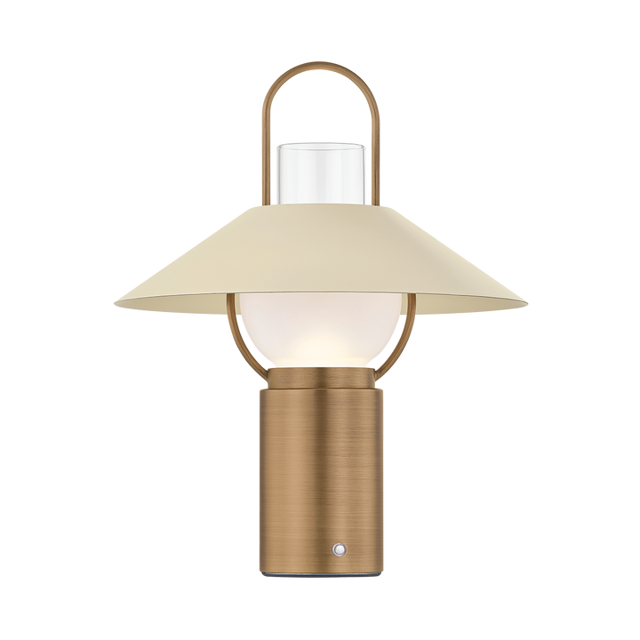 Designed for life in motion, Kindle is a versatile rechargeable lamp with a vintage-inspired silhouette. A Soft Sand shade, etched clear glass, and Patina Brass details lend a warm, artisanal prescence, while the carry handle adds function and charm. At 14.5" high, it's perfectly sized to move effortlessly from room to garden—bringing light wherever it's needed most.