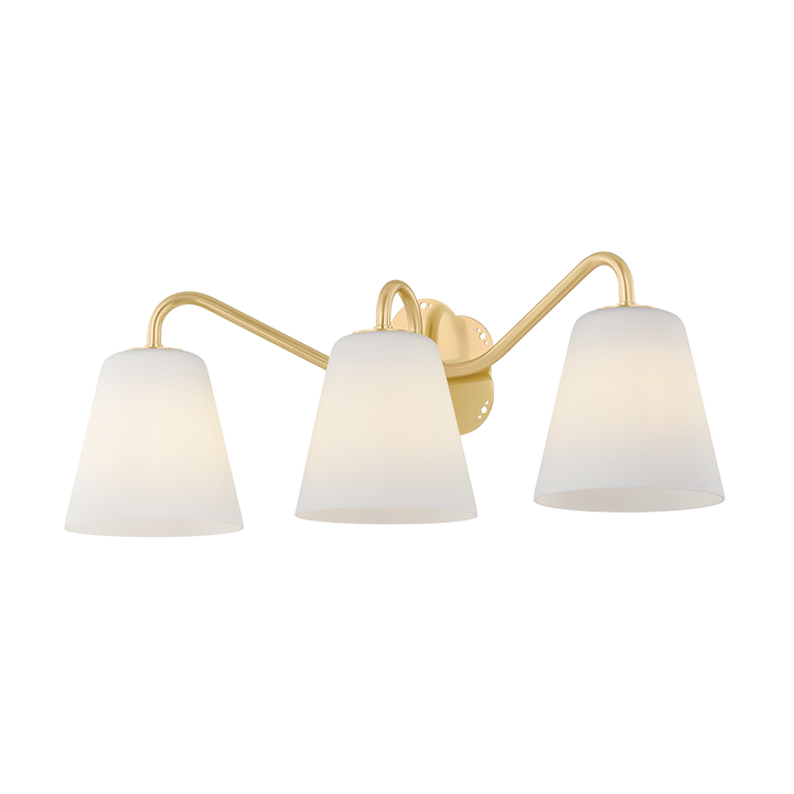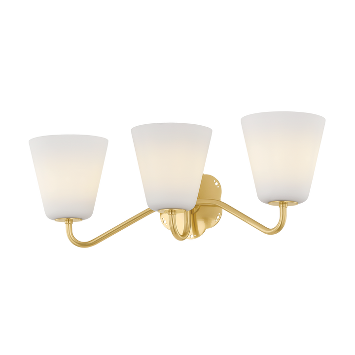 Designed specifically as bath lighting, the Leonella sconce uses a vintage-inspired botanical motif to make a subtle statement. Swooping arms in Aged Brass or Polished Nickel extend from the floral-shaped backplate, which features decorative perforations for added interest. Resembling snowdrops, the matte white bell-shaped shades provide a powerful downlight. Leonella is available with 1, 2, or 3 lights to illuminate daily routines.
