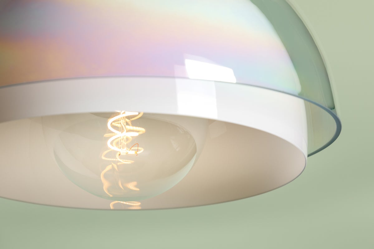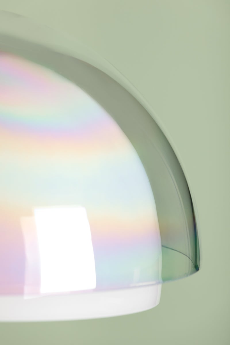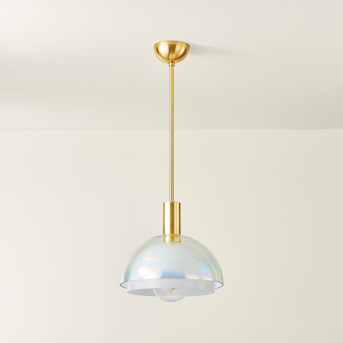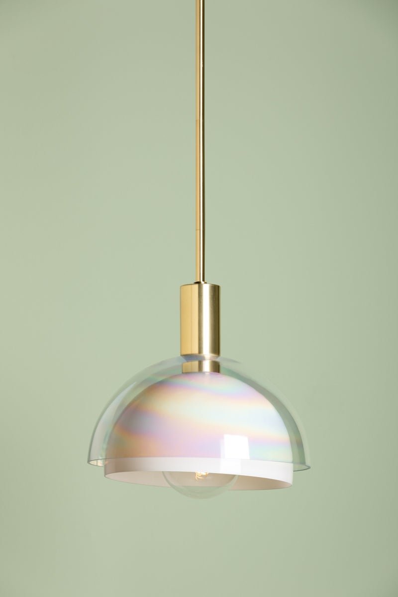 Playing with the layering of glass, Modena features two spherical shades that encircle the light source, creating a bubble-like halo. An opal interior shade is paired with an iridescent exterior shade, creating an ethereal interplay of light and shapes. The Aged Brass metalwork adds to the luxurious feel of the fixture as it reflects the light.
