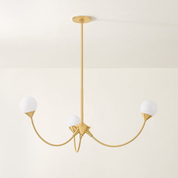 The silhouettes of the Natasha family are classically decadent, yet light and sparse. Swooping arches and balanced cloud glass orbs make the chandeliers feel daring, while the sconce is soft and simplified. Finished in Aged Brass, Natasha hits the right notes between new and nostalgic for a fresh form language that will invigorate any space.