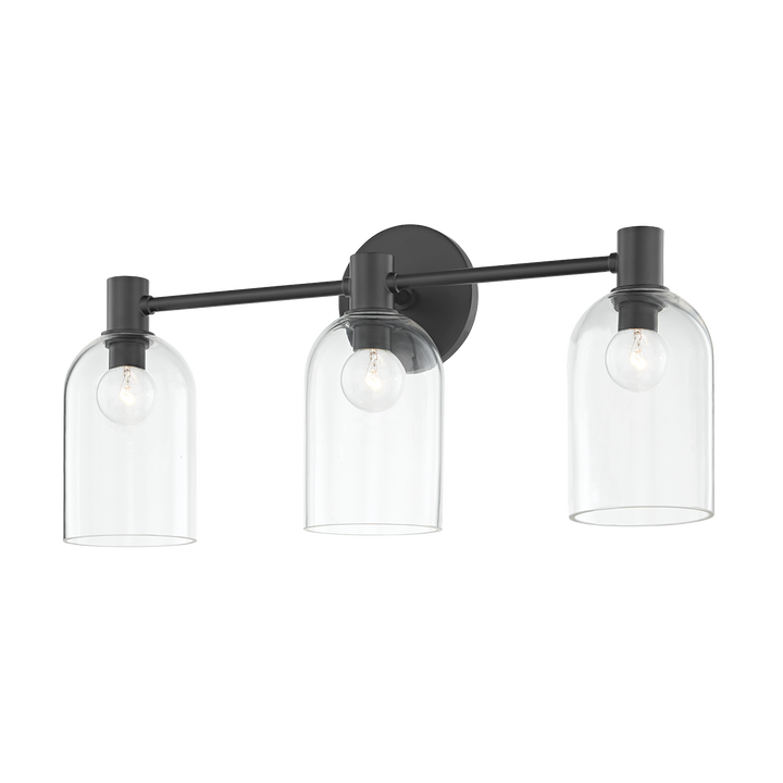 Drawing inspiration from antique glass bottles, a cloche-like shade in clear glass showcases a single bulb nested at the top of the glass. A simple metal arm, circular backplate and cylindrical holder add to Paisley's crisp, clean look. While the two- and three-light options are an obvious choice for the bath, the single-light sconce would also work well in a hallway or beside a fireplace or window.