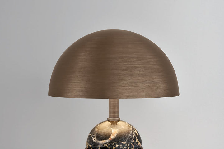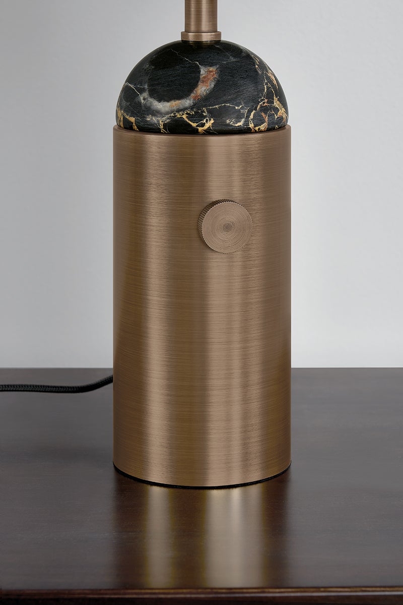 Parkston takes a mid-century modern brass design and elevates it with luxury stone. This handsome accent lamp includes a piece of honed nero madera marble with intricate white and brown veining that comes to life in the light. A knurled switch adds texture and design interest to the Heritage Bronze -finished base. Standing 14” tall, Parkston is a dreamy addition to bookshelves, kitchens, or any small space in need of big style.