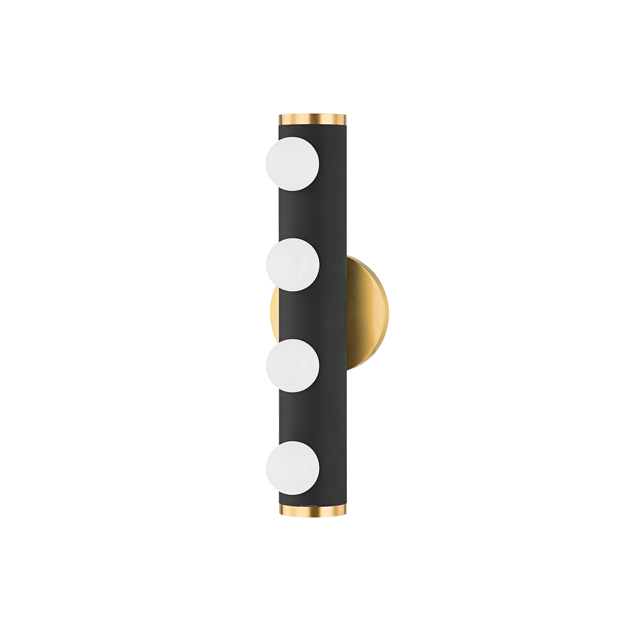 Penny gives familiar Hollywood-style lighting a fresh feel. Small opal matte globes spread across a cylinder of textured white or textured black for a glamorous look that provides ample bright light. An aged brass backplate and decorative end caps give the fixture a fun, updated look. With the ability to mount horizontally or vertically, Penny makes perfect sense over or alongside the vanity in the bath.