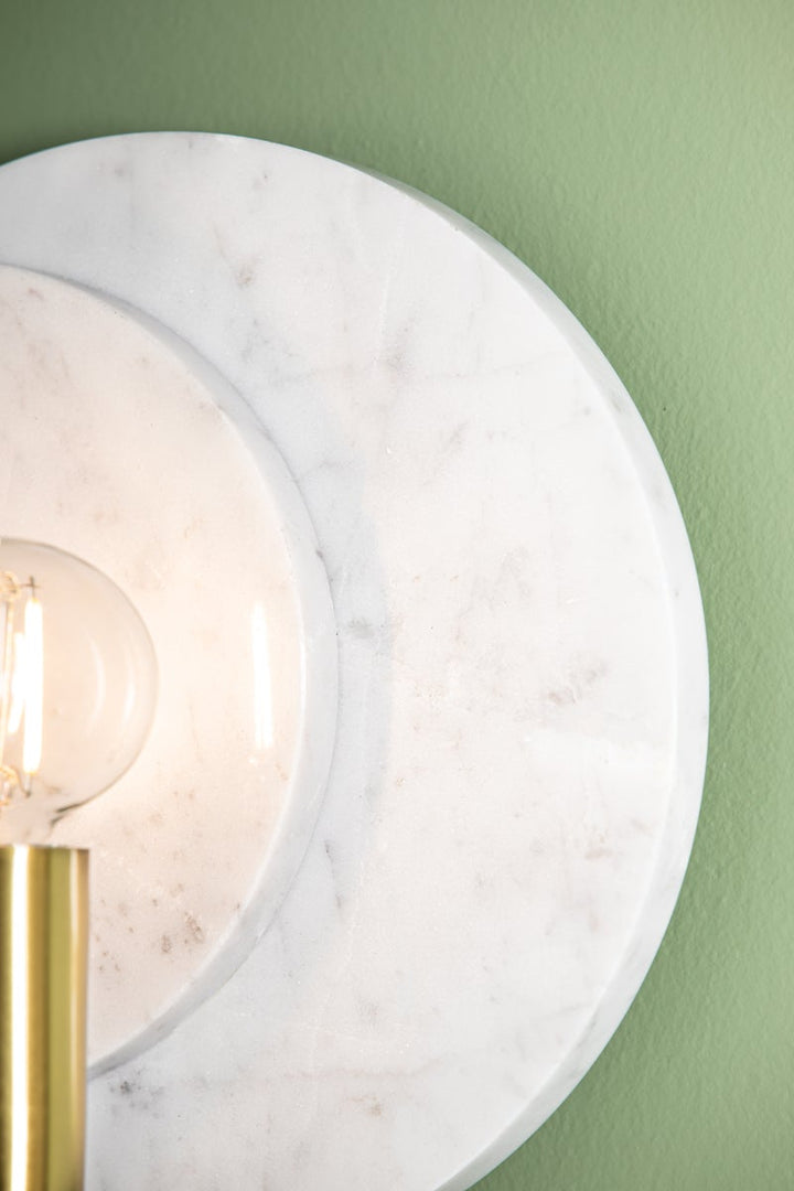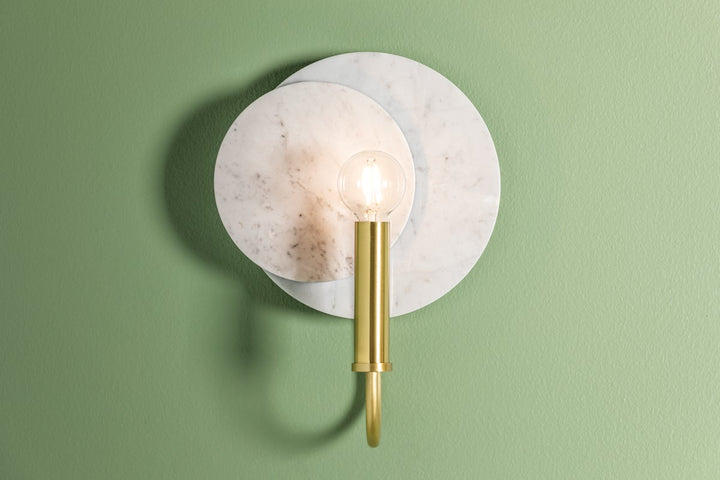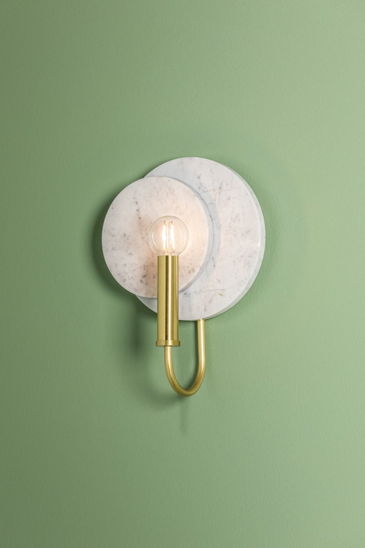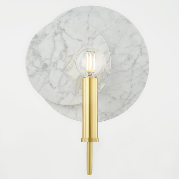 This one-light wall sconce plays with geometry, scale, material, and style—the result is a design that feels familiar yet unexpected and a look that is both classic and contemporary. In a unique combination of metal and natural material, a recognizable Aged Brass candlestick sits in front of a disc of white carrara marble that can change position to create a left and right sconce when used in pairs for a symmetrical effect.Tula makes an artistic statement that blends with many interiors.