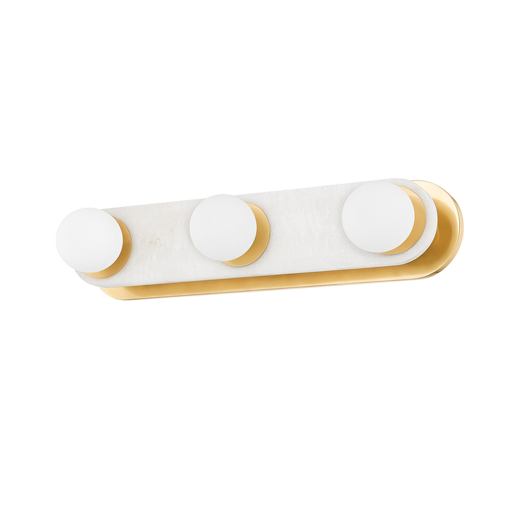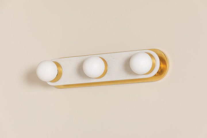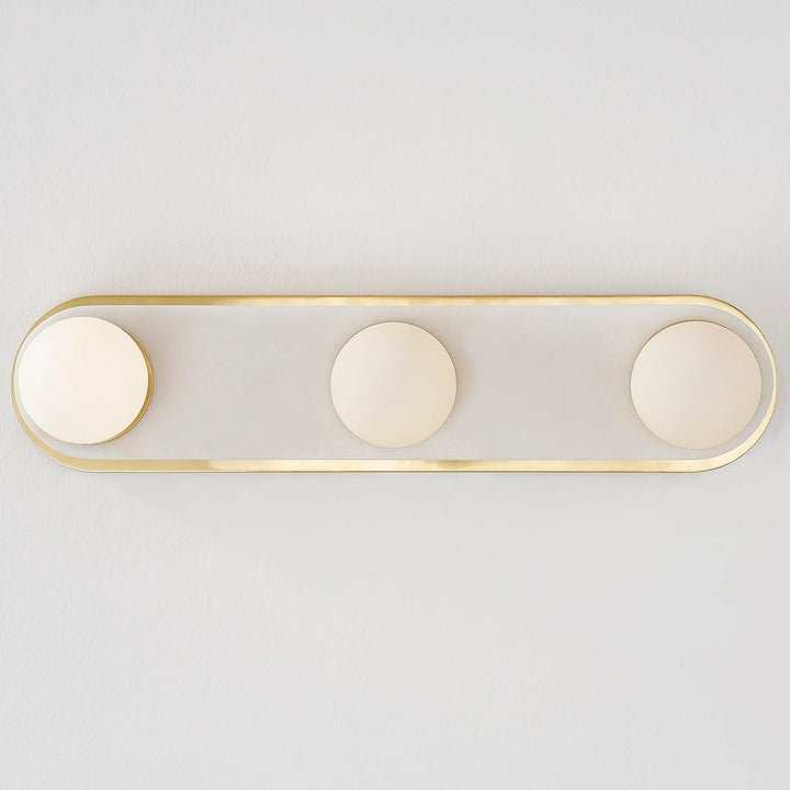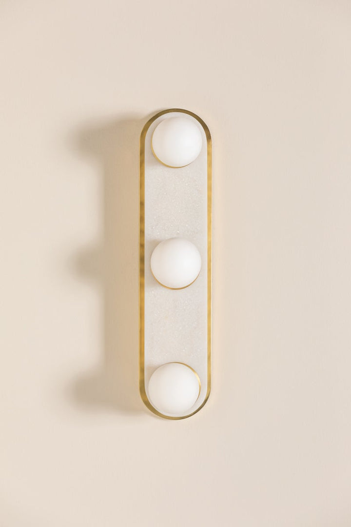 Glass globes are backed in Aged Brass then displayed on a piece of Soft Thassos white marble and mounted to a similarly shaped piece of Aged Brass creating a gorgeous layering effect. The marble has very little veining or variation, and the streamlined racetrack silhouette gives the design a jewelry-like quality. The three-light sconce can be mounted horizontally or vertically making it ideal for the bath or powder room.