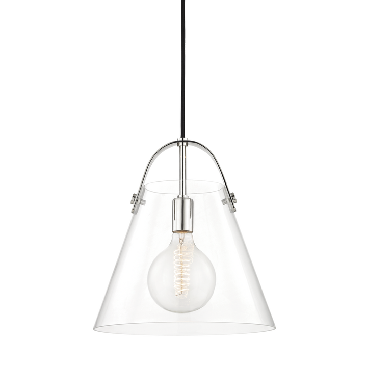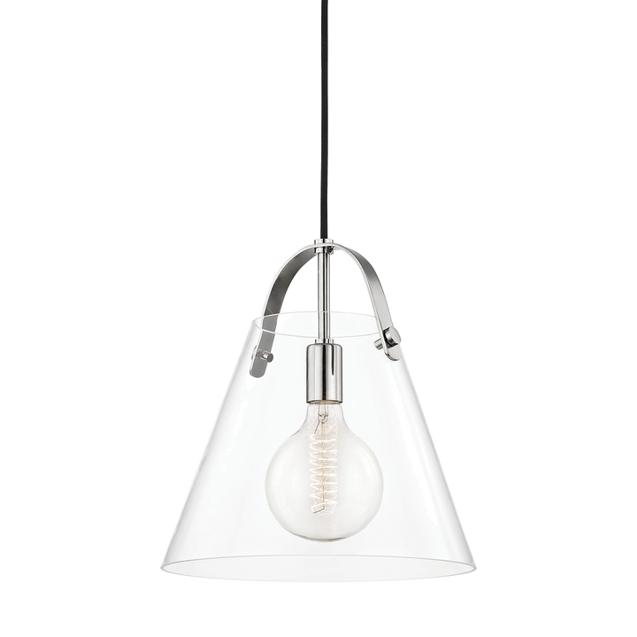 A metal strap arches over the open-top shade of this bell-shaped fixture that rings with style. An incandescent bulb shines through the clear glass shade—adding lots of light anywhere the linear, sconce or pendant is placed.